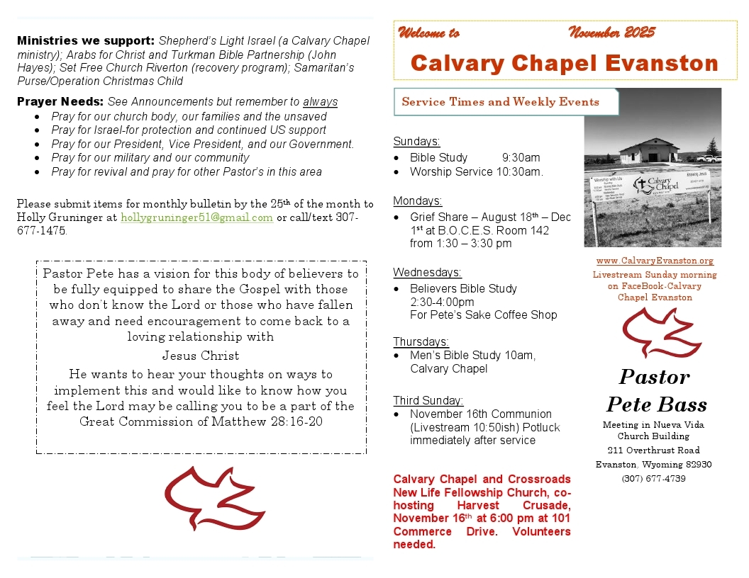 November 25 bulletin Calvary Chapel Evanston Posted on November 8, 2025 by HCrossMNovember 8, 2025 Click link below to view or print entire bulletin November 2025 Bulletin